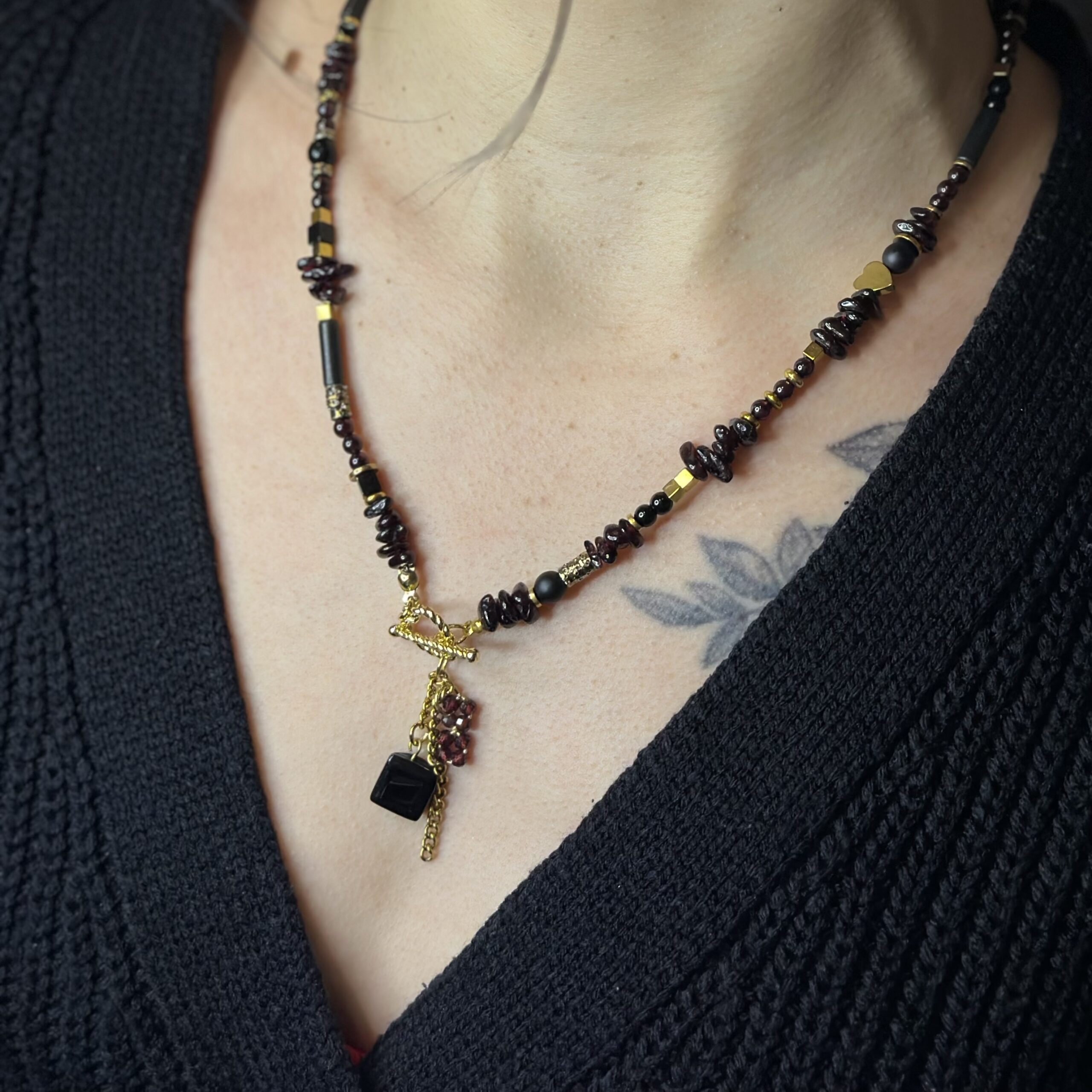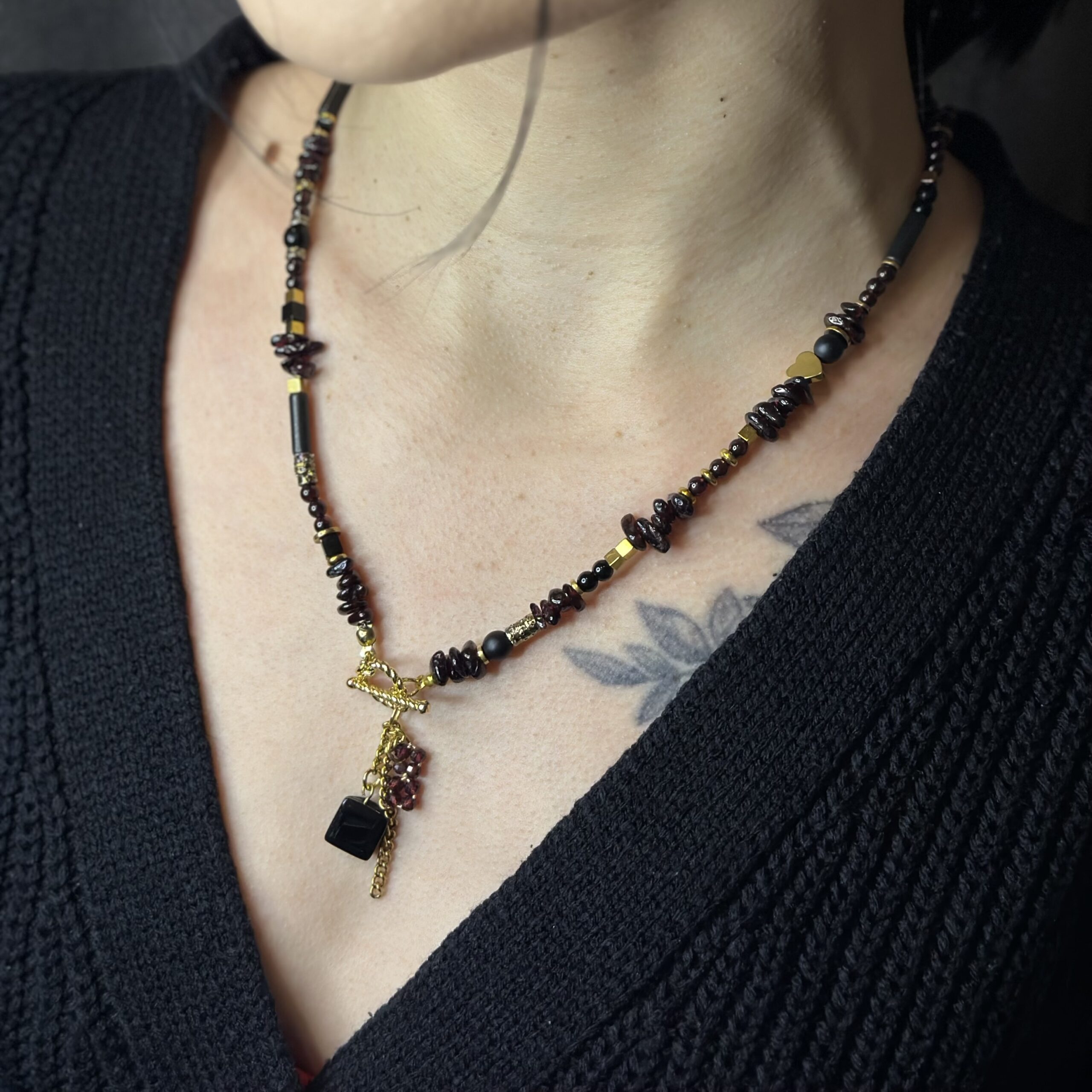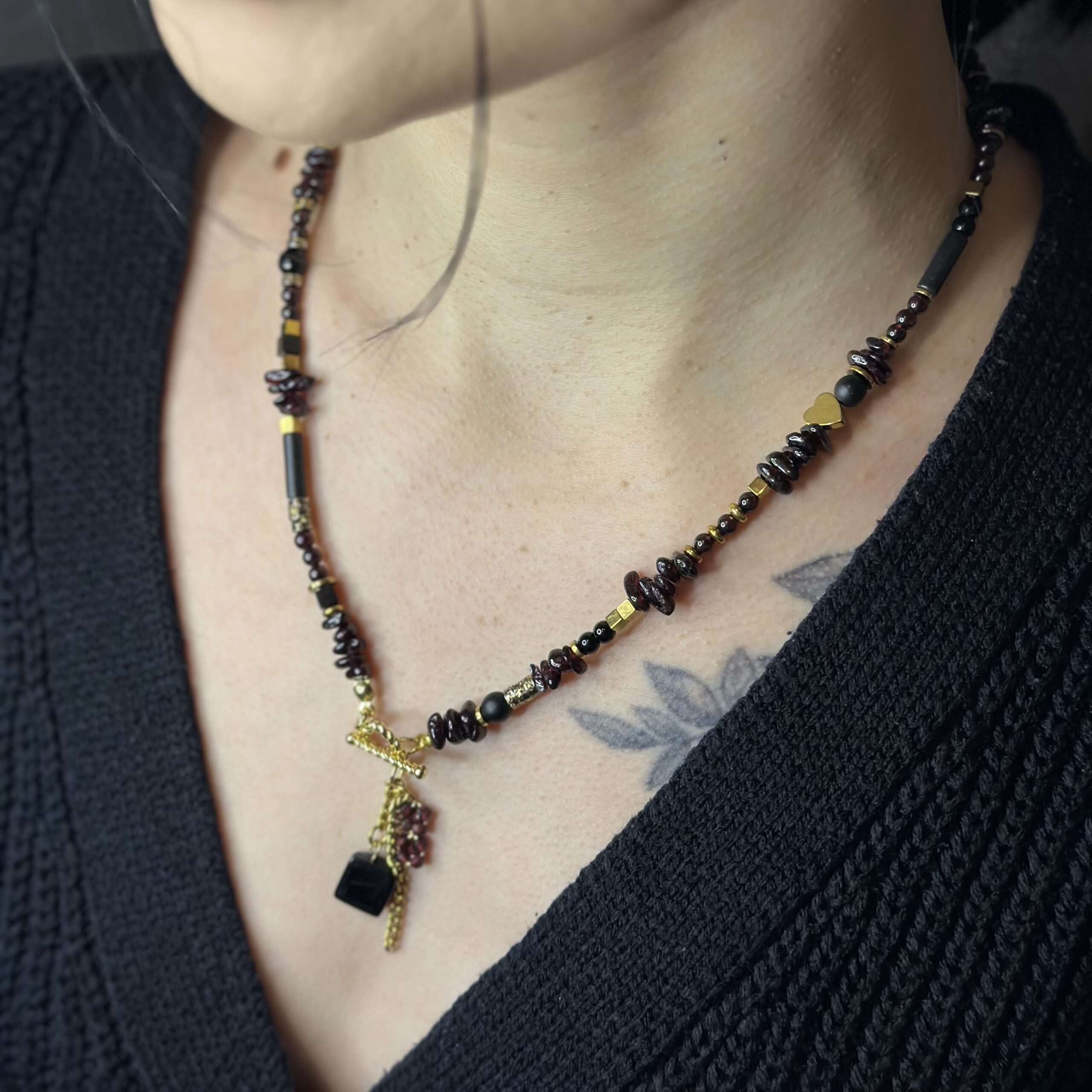 Naszyjnik „Winne Serce” tworzę ręcznie z kamieni naturalnych w głębokich, winnych i czarnych odcieniach, które nadają biżuterii elegancki i wyrazisty charakter. Każdy element dobieram starannie, aby całość tworzyła harmonijną, spójną kompozycję.
