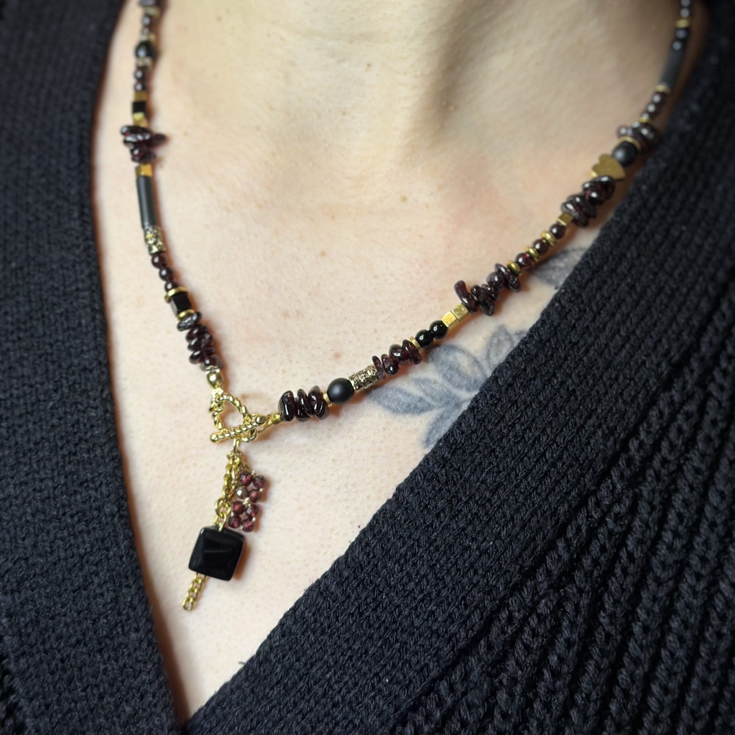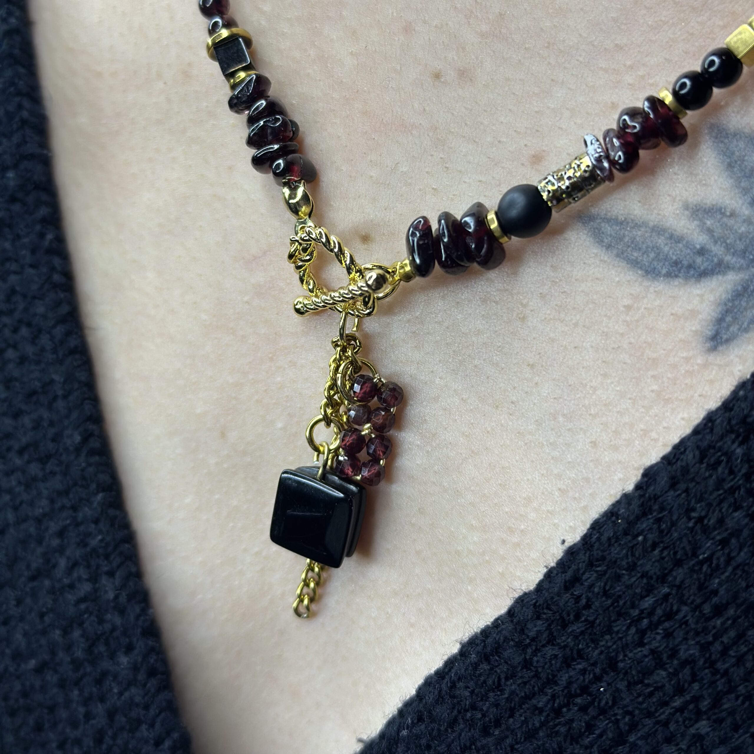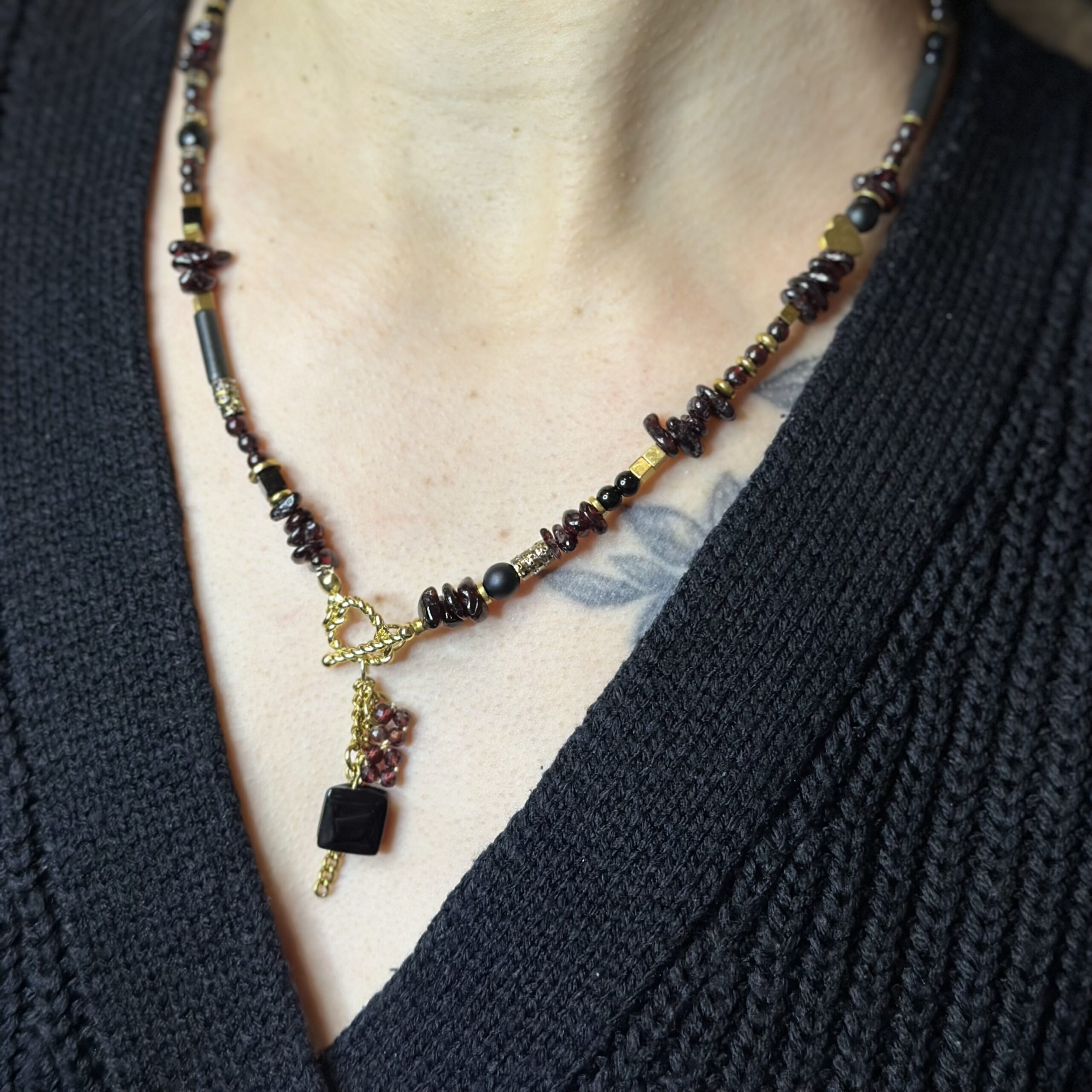 Naszyjnik „Winne Serce” tworzę ręcznie z kamieni naturalnych w głębokich, winnych i czarnych odcieniach, które nadają biżuterii elegancki i wyrazisty charakter. Każdy element dobieram starannie, aby całość tworzyła harmonijną, spójną kompozycję.