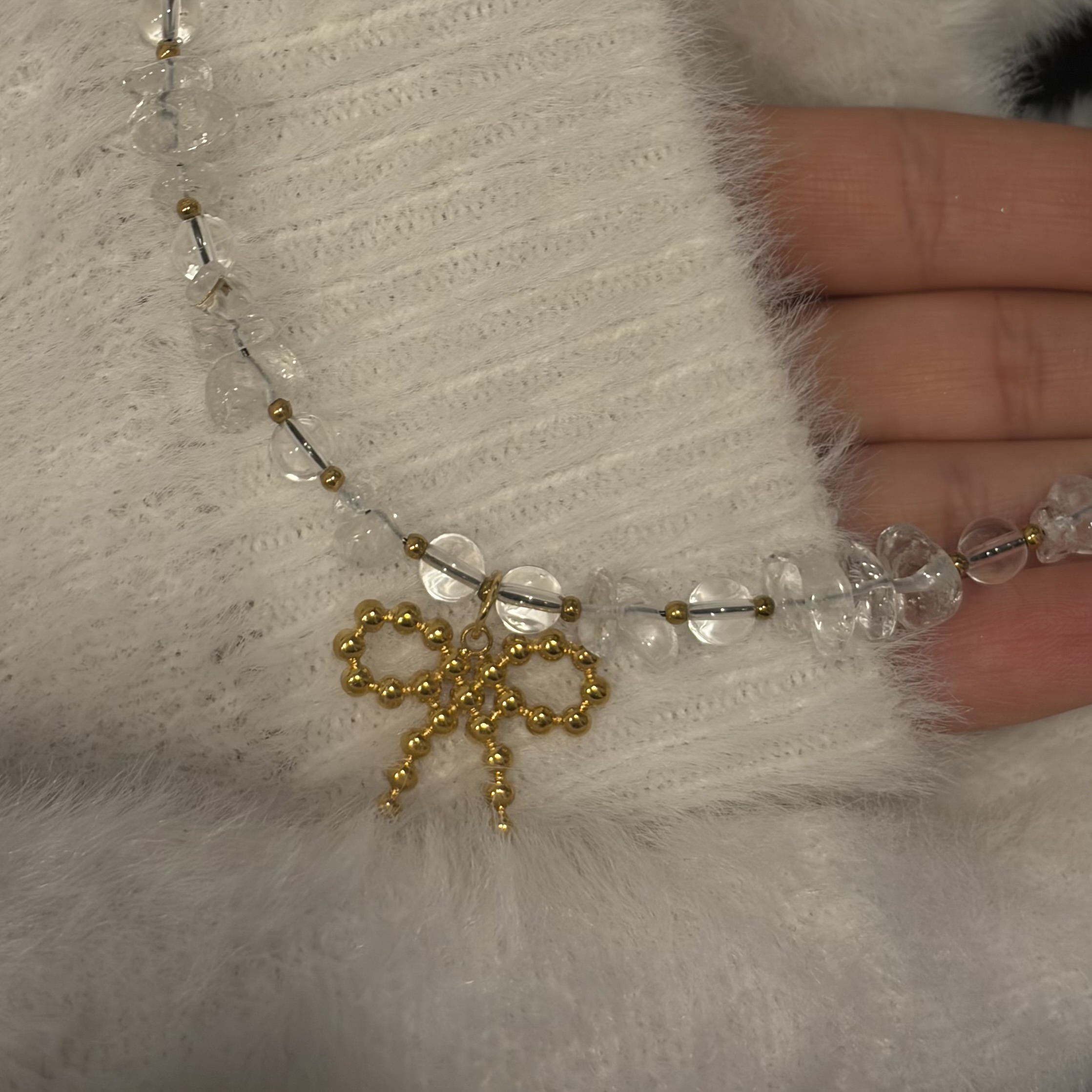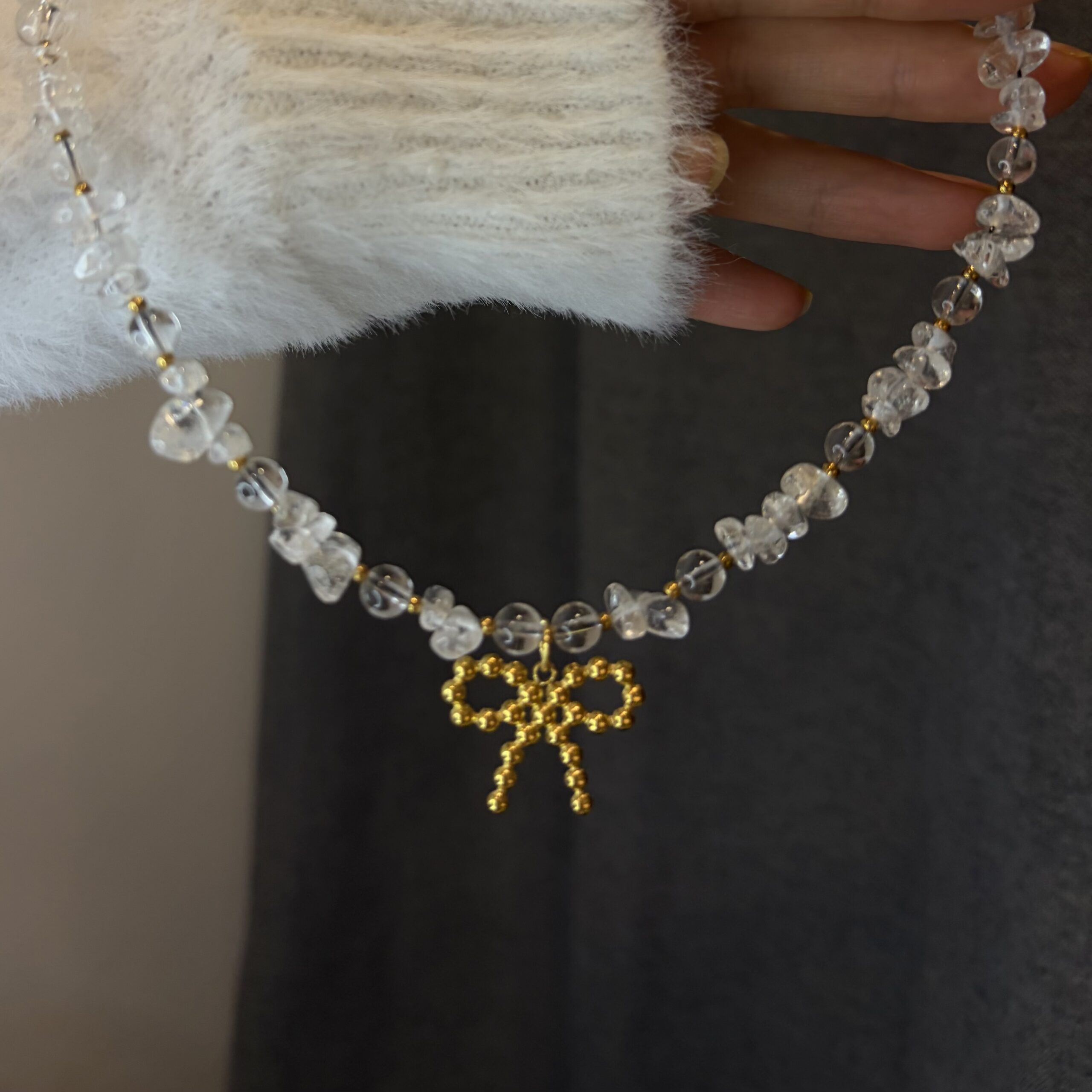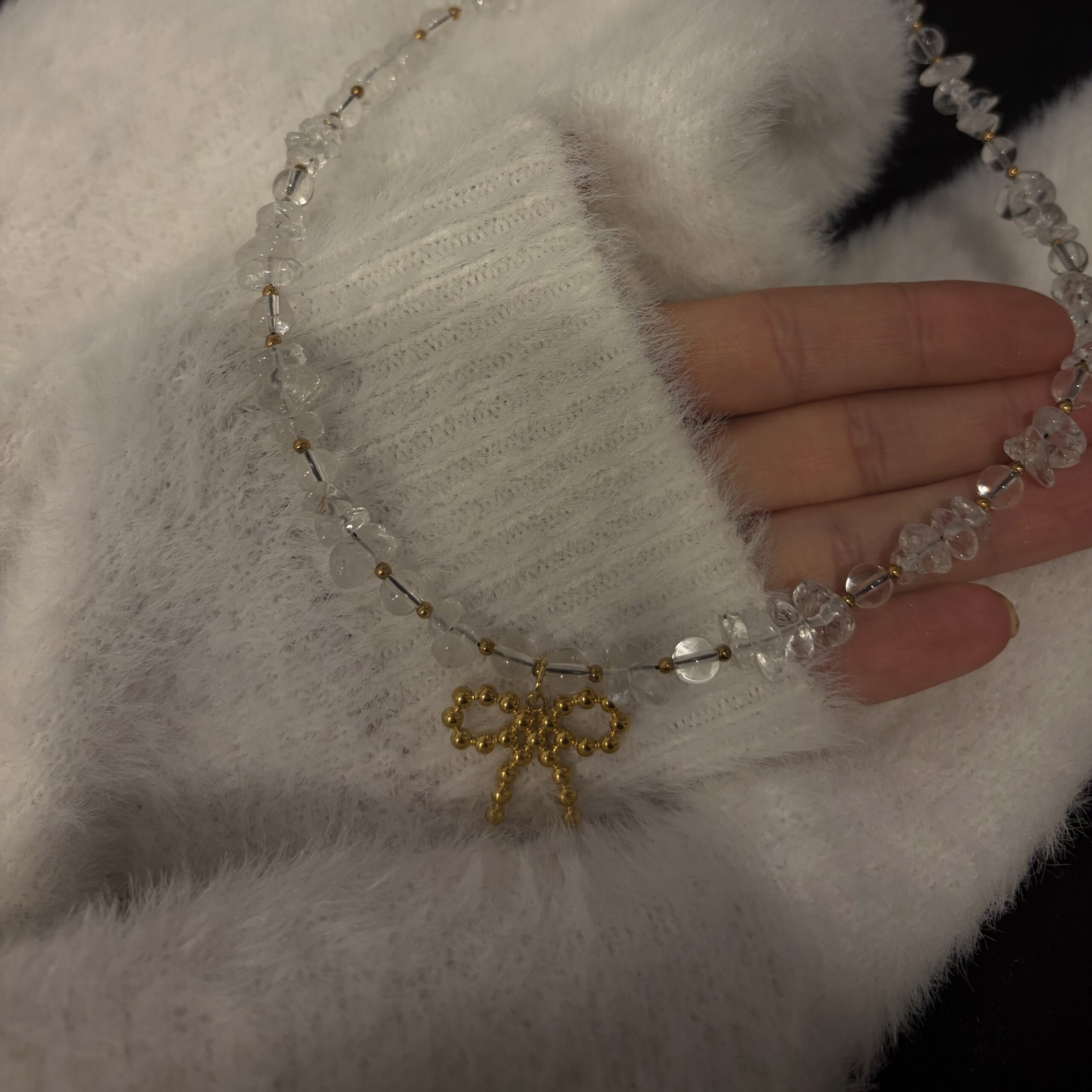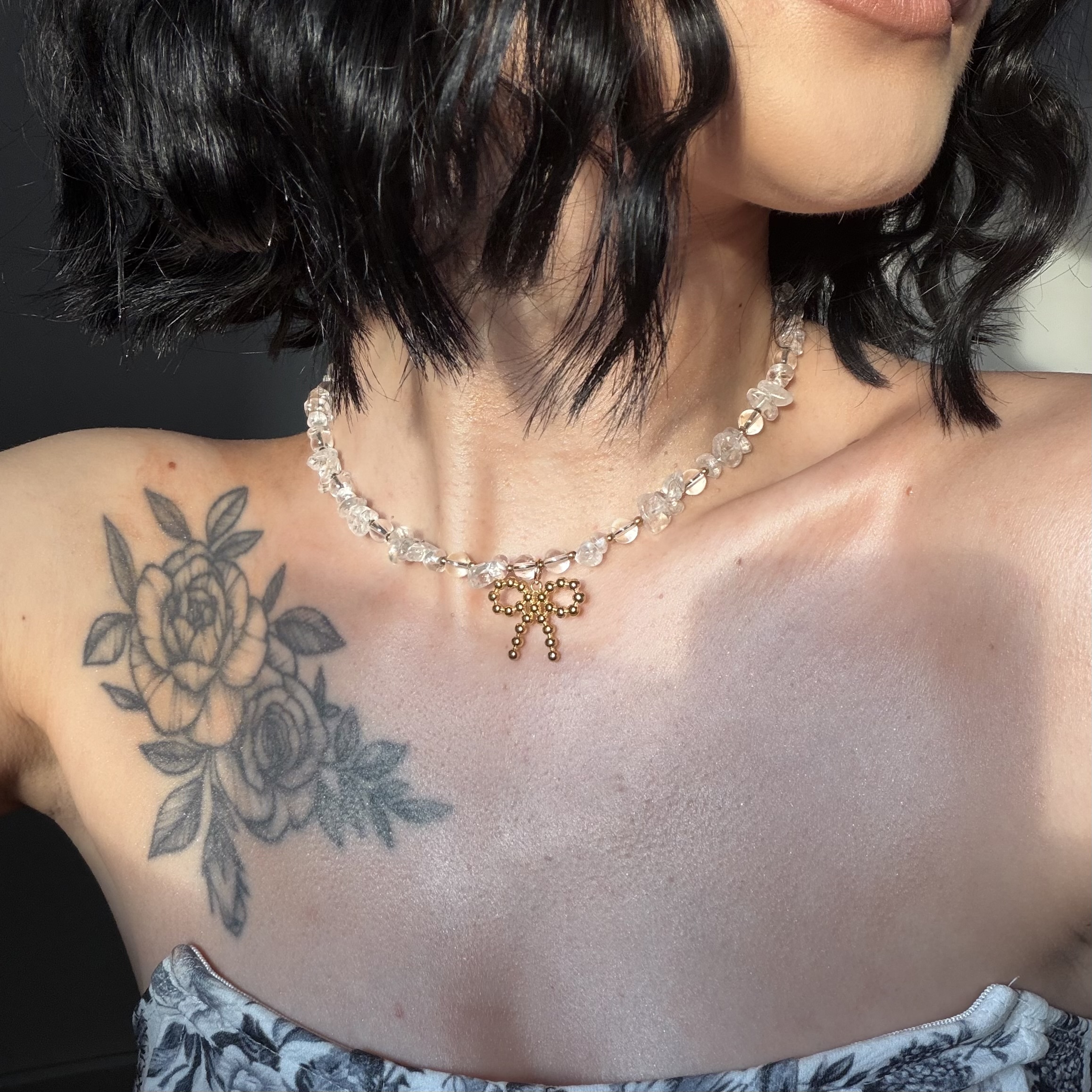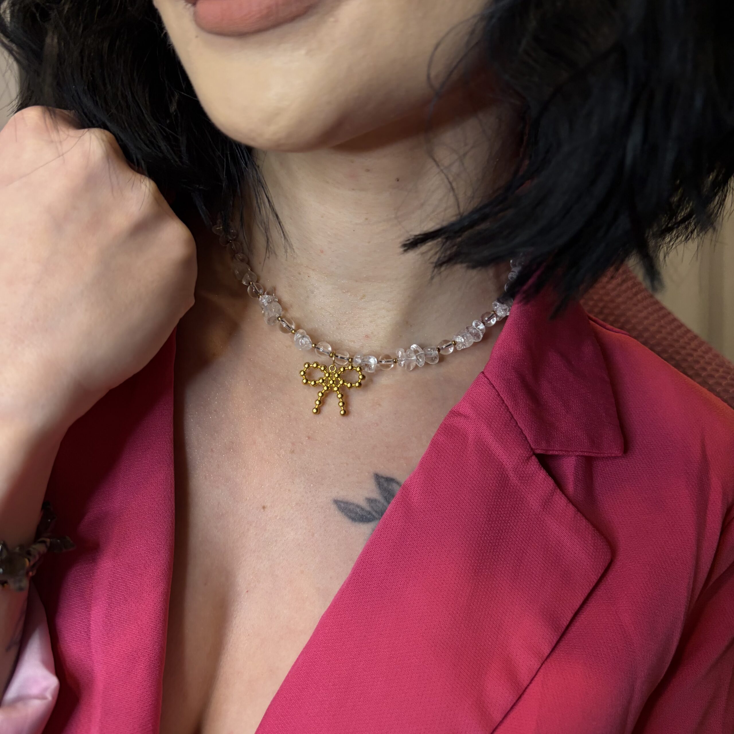 Naszyjnik z kryształu górskiego z kokardką to wyjątkowa, ręcznie tworzona biżuteria, która łączy subtelny blask naturalnych kamieni z delikatną, kobiecą formą.