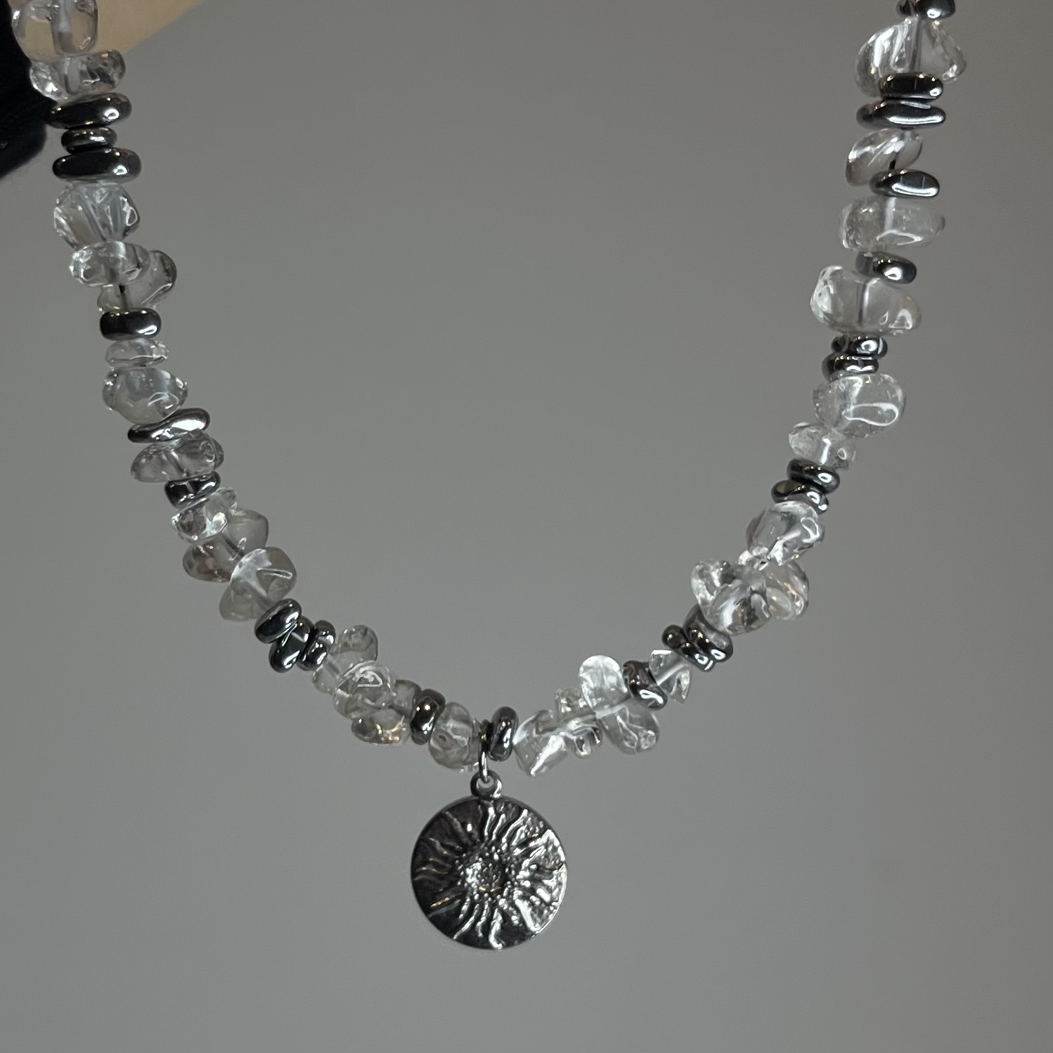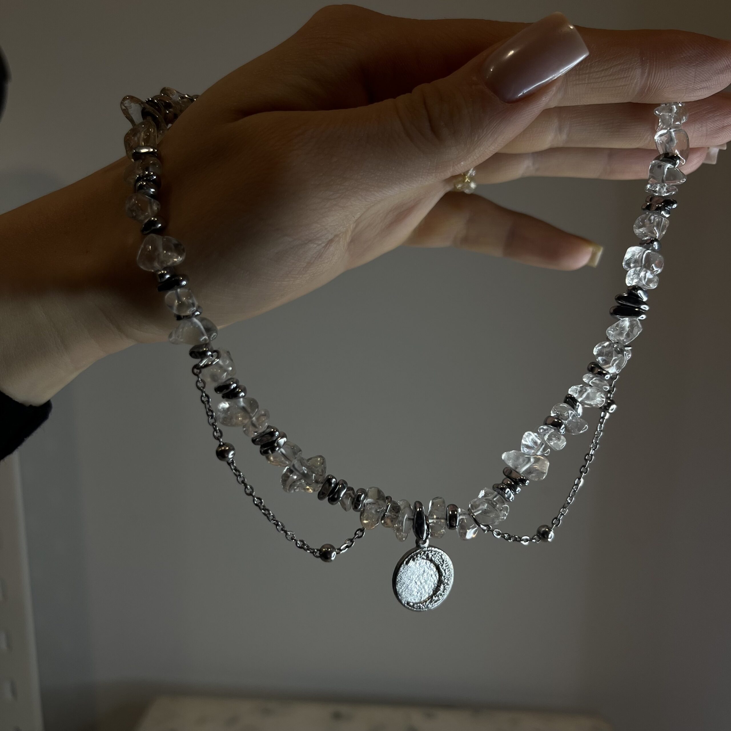 Naszyjnik z kryształu górskiego i srebrnego hematytu przyciąga subtelnym blaskiem i harmonijną formą. Tworzę go z naturalnej sieczki kryształu górskiego, przełamanej drobnymi elementami srebrnego hematytu. Całość uzupełnia delikatna srebrna zawieszka umieszczona centralnie oraz ozdobne łańcuszki, które tworzą efekt lekkości i eleganckiej warstwowości.