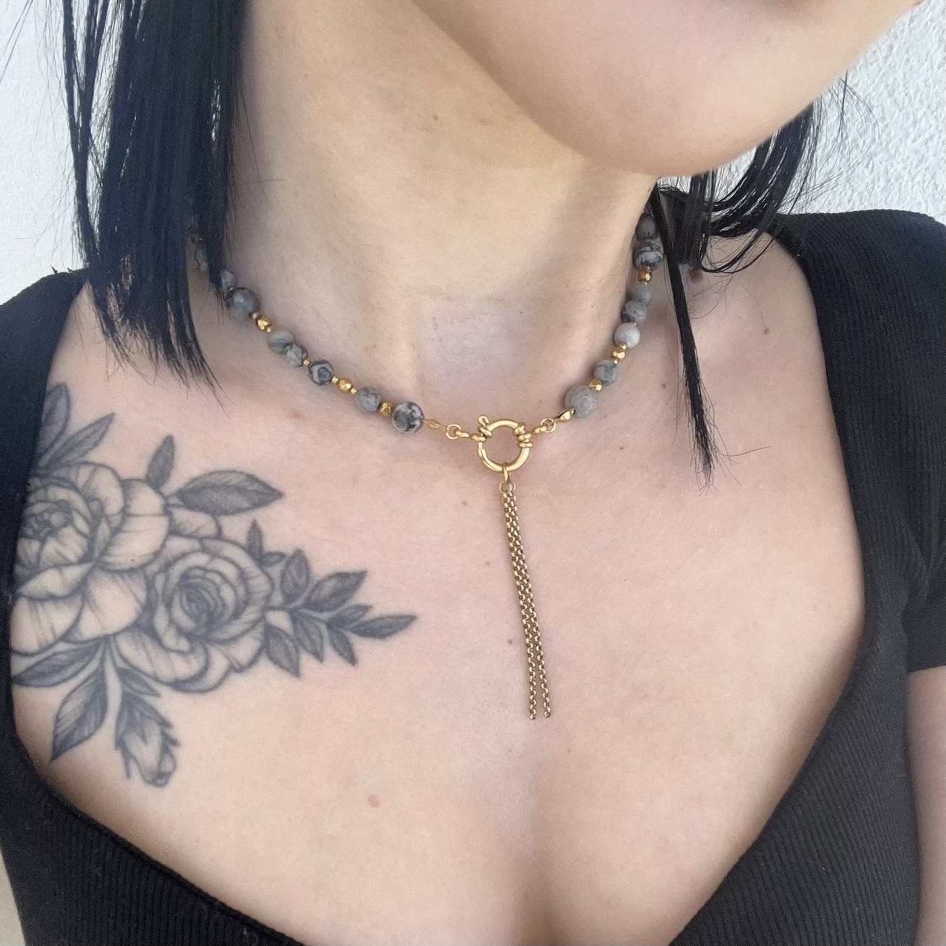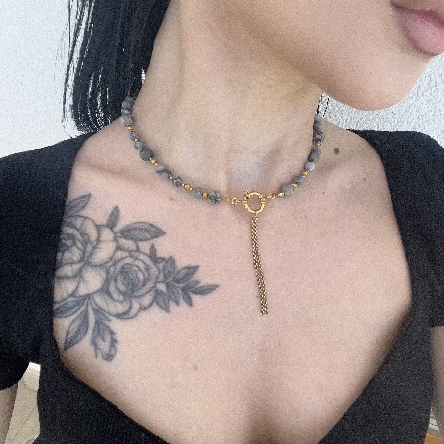 Delikatny i wyrafinowany, ten naszyjnik z szarego jaspisu to harmonijne połączenie surowego piękna natury z klasyczną elegancją. Chłodne, stonowane odcienie kamieni szlachetnie kontrastują ze złotymi akcentami, tworząc kompozycję pełną subtelnego blasku.