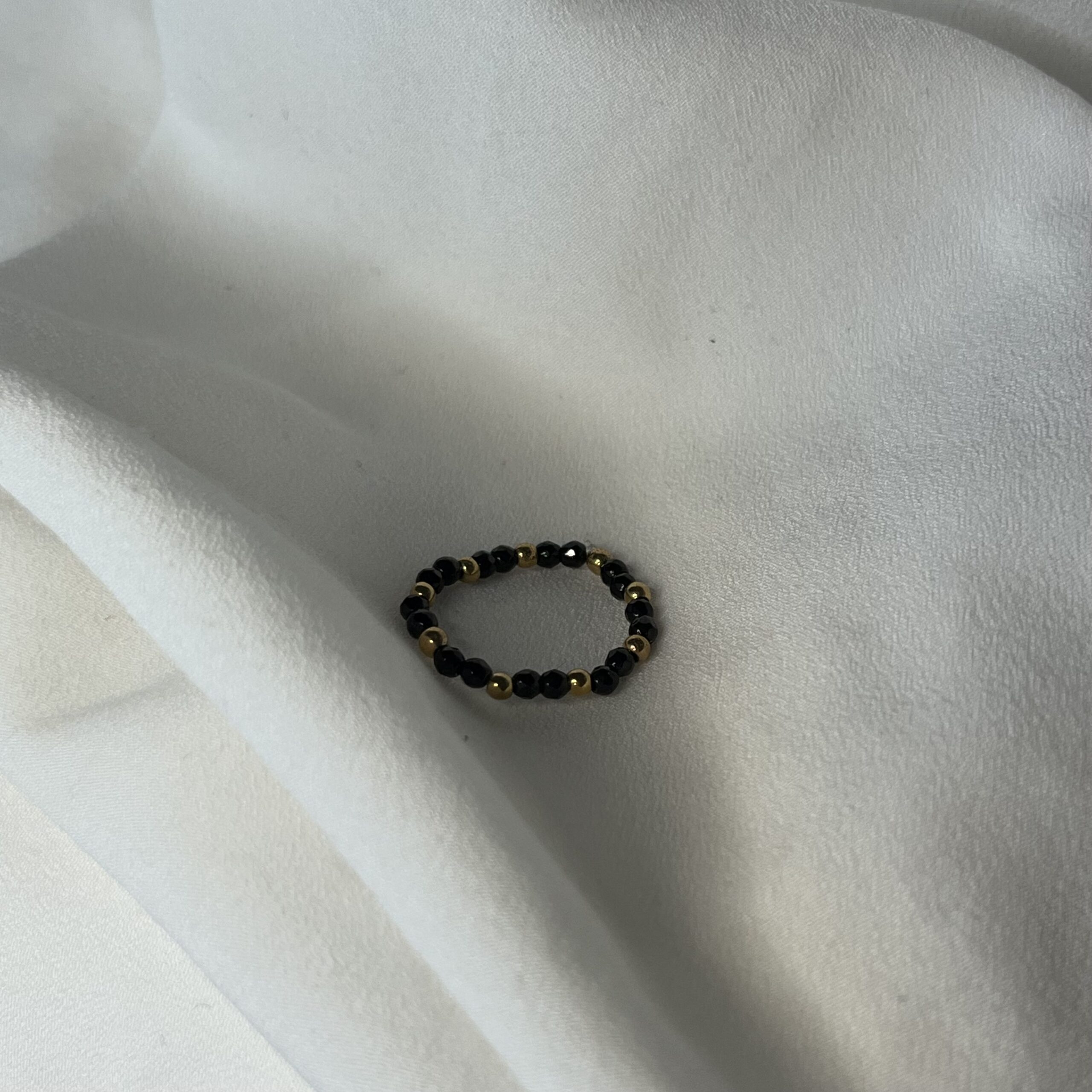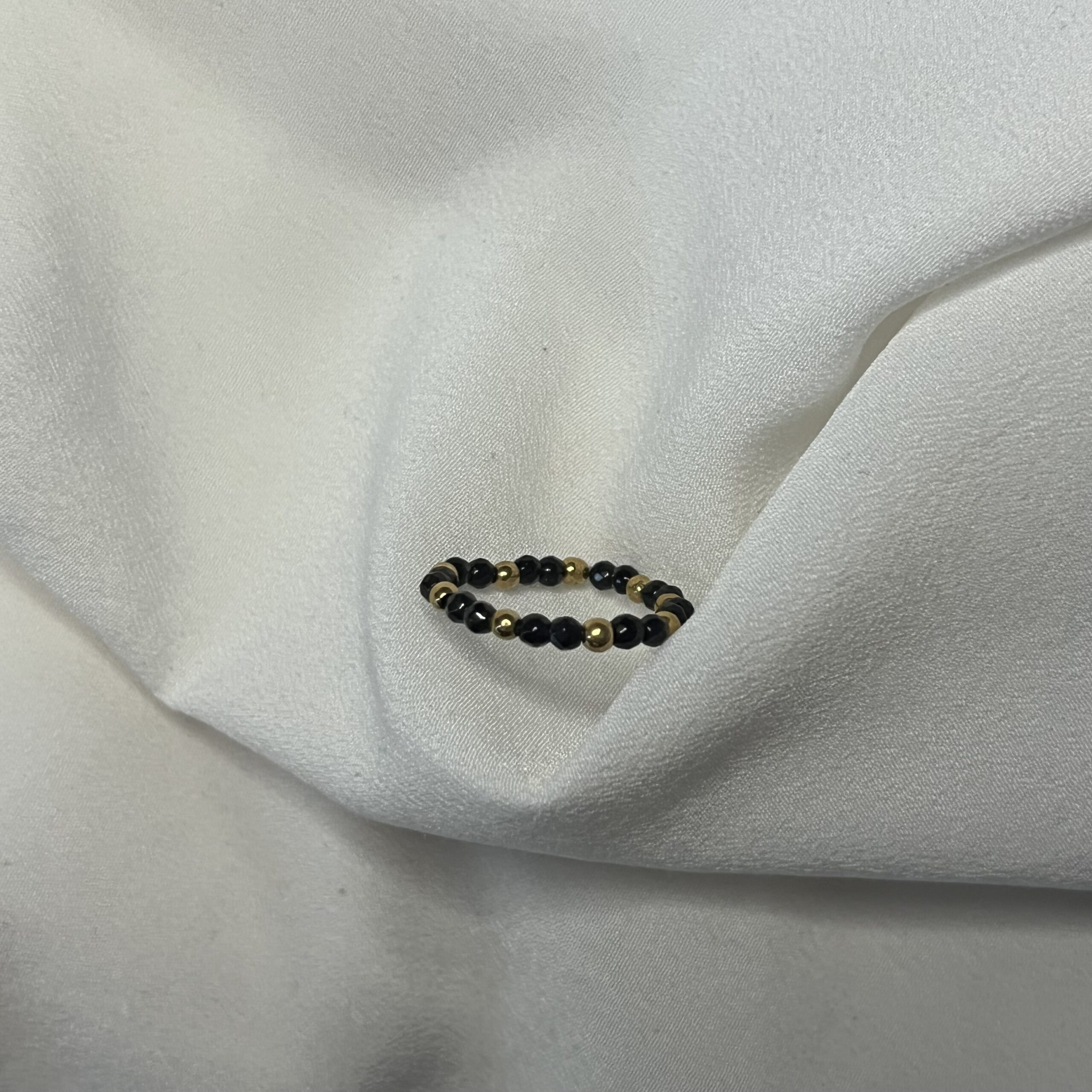 Elastyczny pierścionek wykonany z kamieni naturalnych- hematyt.Złote przekładki hematytu.