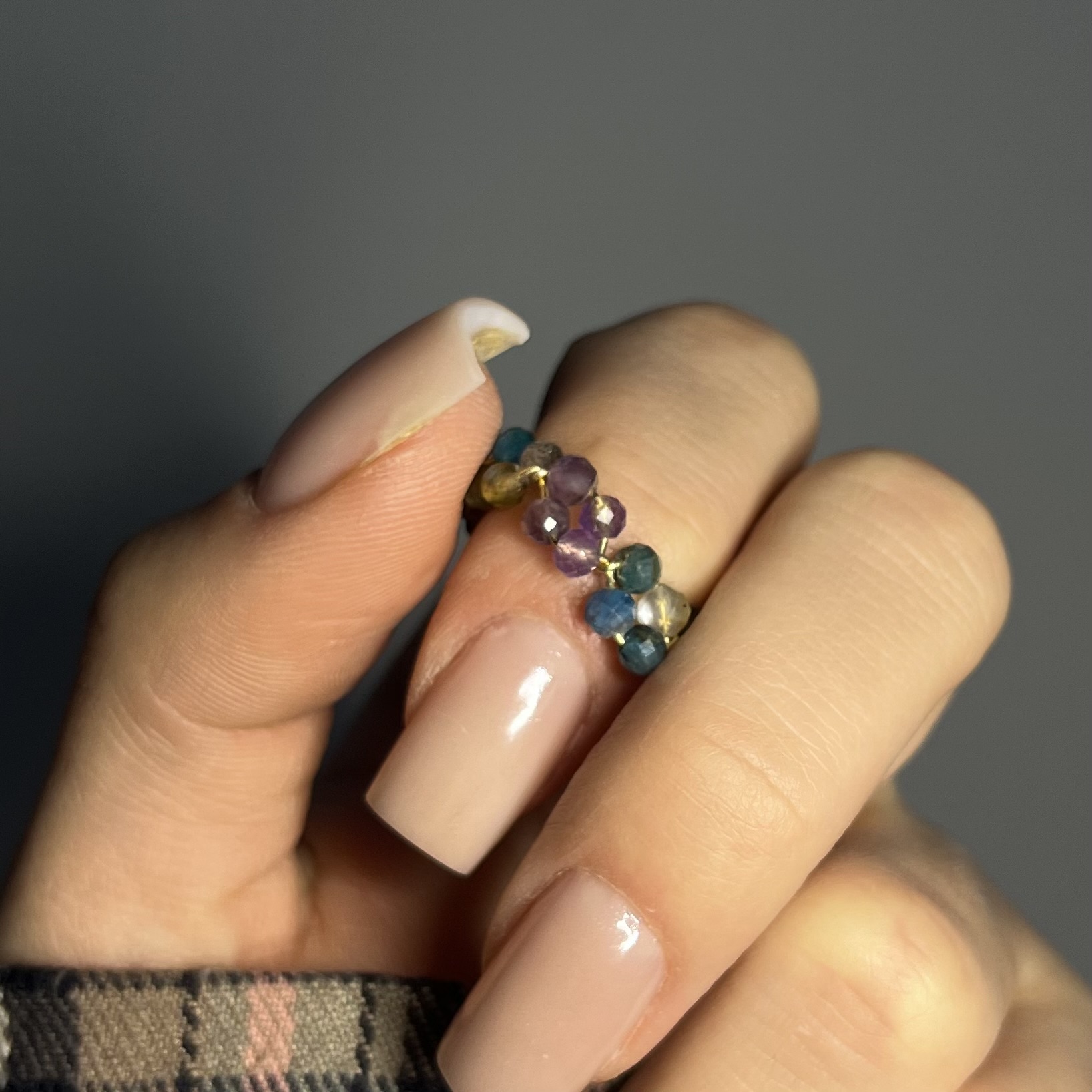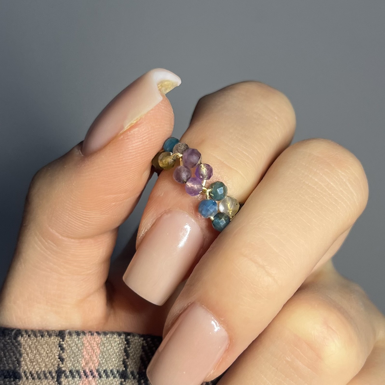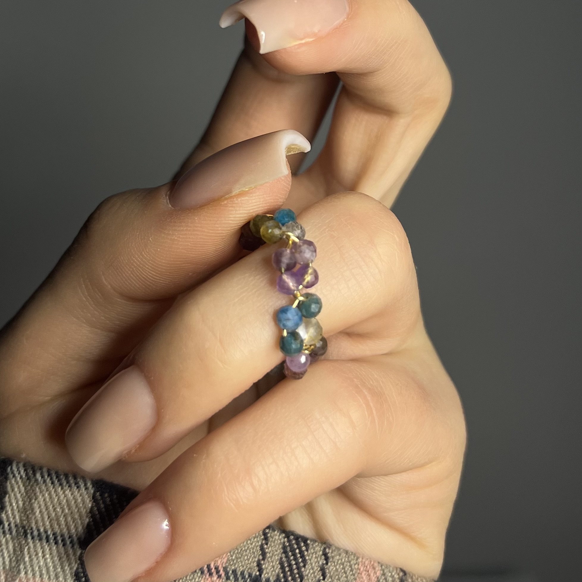 Pierścionek z apatytu i ametystu tworzę ręcznie z naturalnych, fasetowanych kamieni, które zachwycają połączeniem chłodnych odcieni błękitu, fioletu i delikatnych akcentów przejrzystości. Każdy kamień starannie nawlekam na drucik i precyzyjnie zawijam, dbając o estetykę oraz trwałość całej formy.