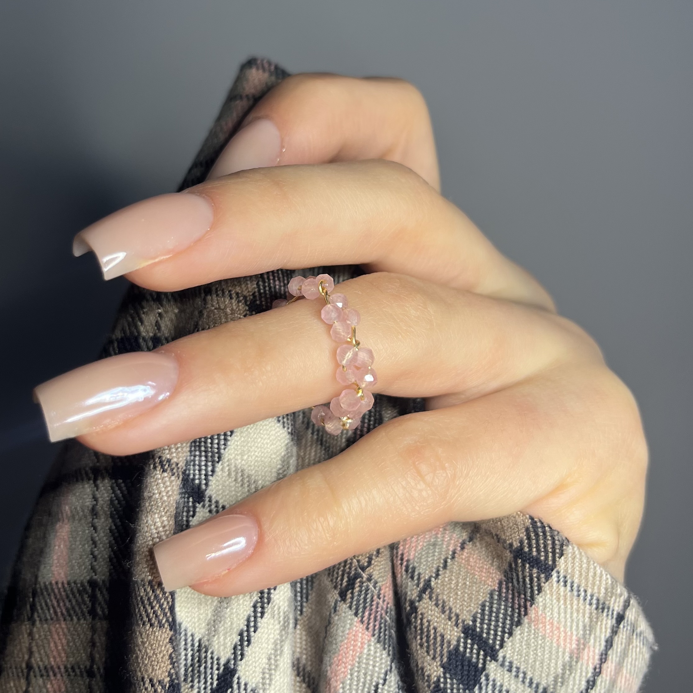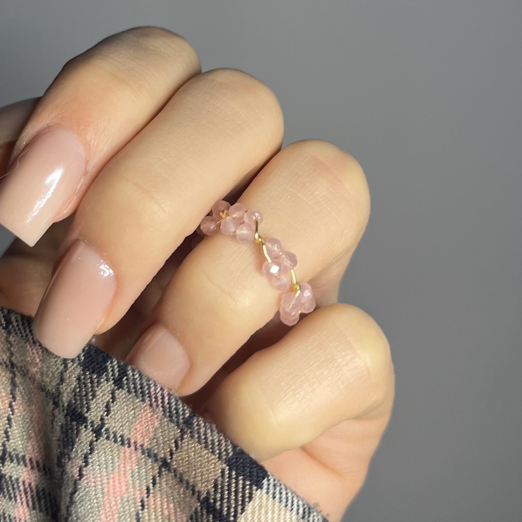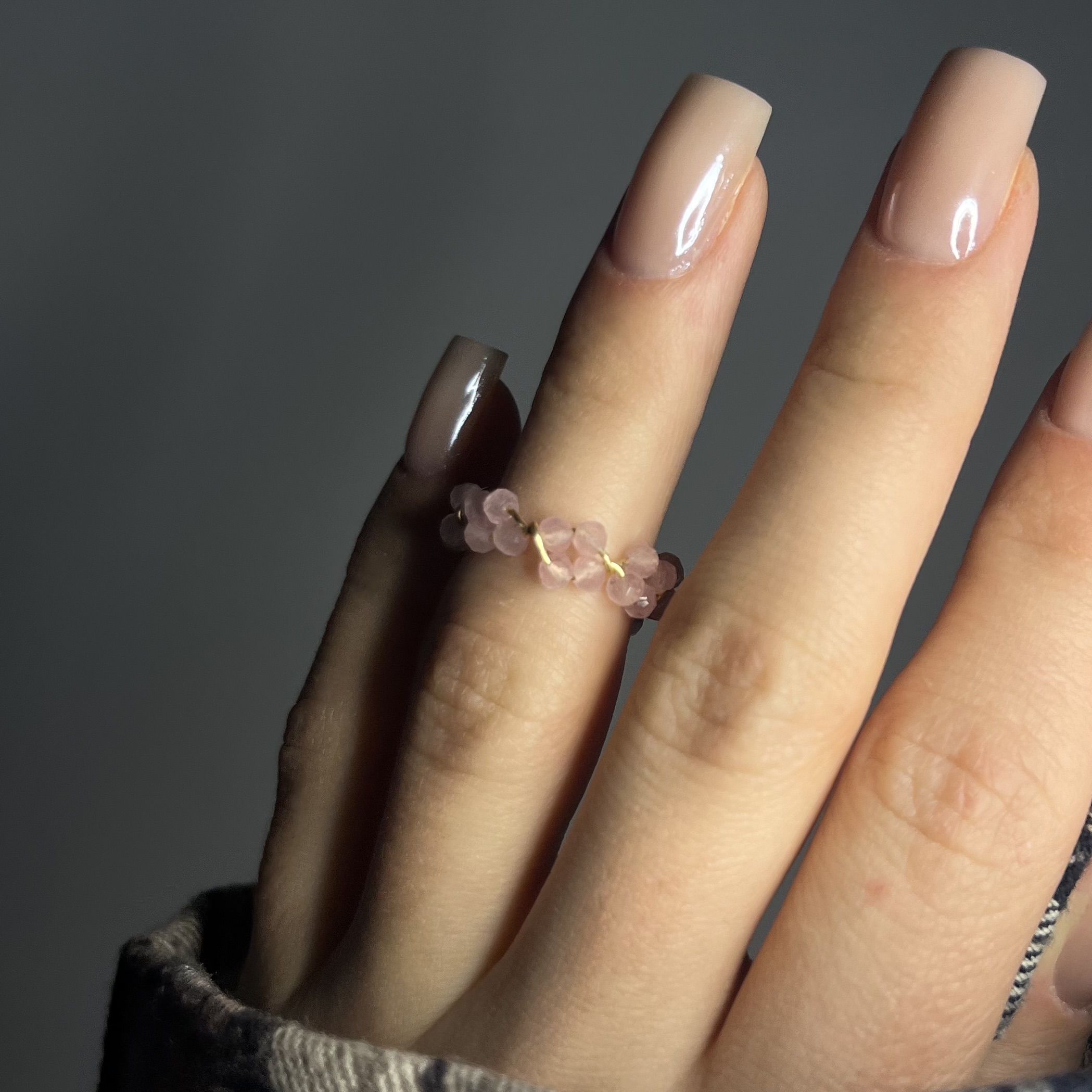 Pierścionek z kwarcu różowego tworzę ręcznie z naturalnych, delikatnie fasetowanych kamieni o subtelnym, pudrowo-różowym odcieniu. Każdy kamień nawlekam na drucik i precyzyjnie zawijam, dzięki czemu pierścionek zachowuje lekkość, trwałość i elegancki wygląd.