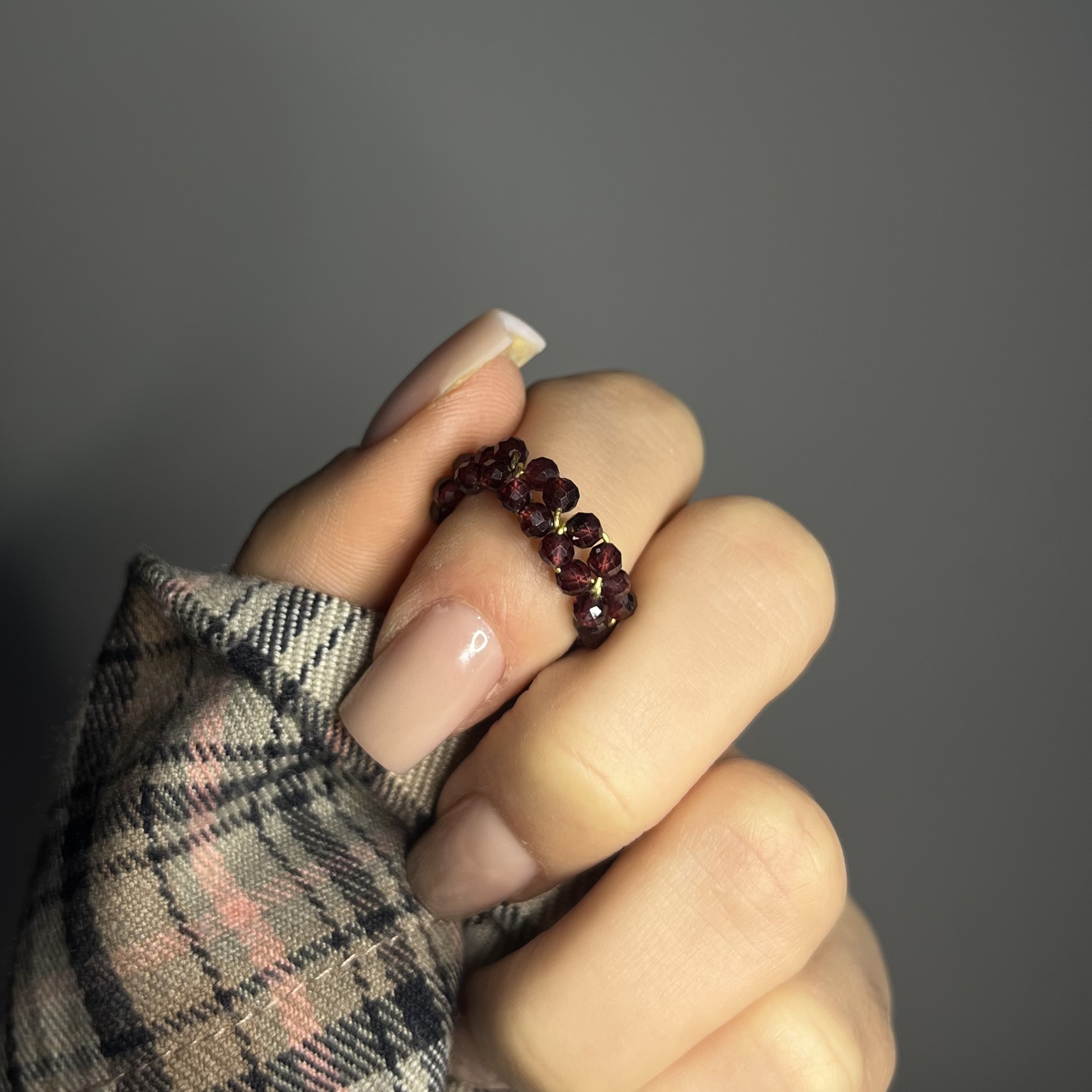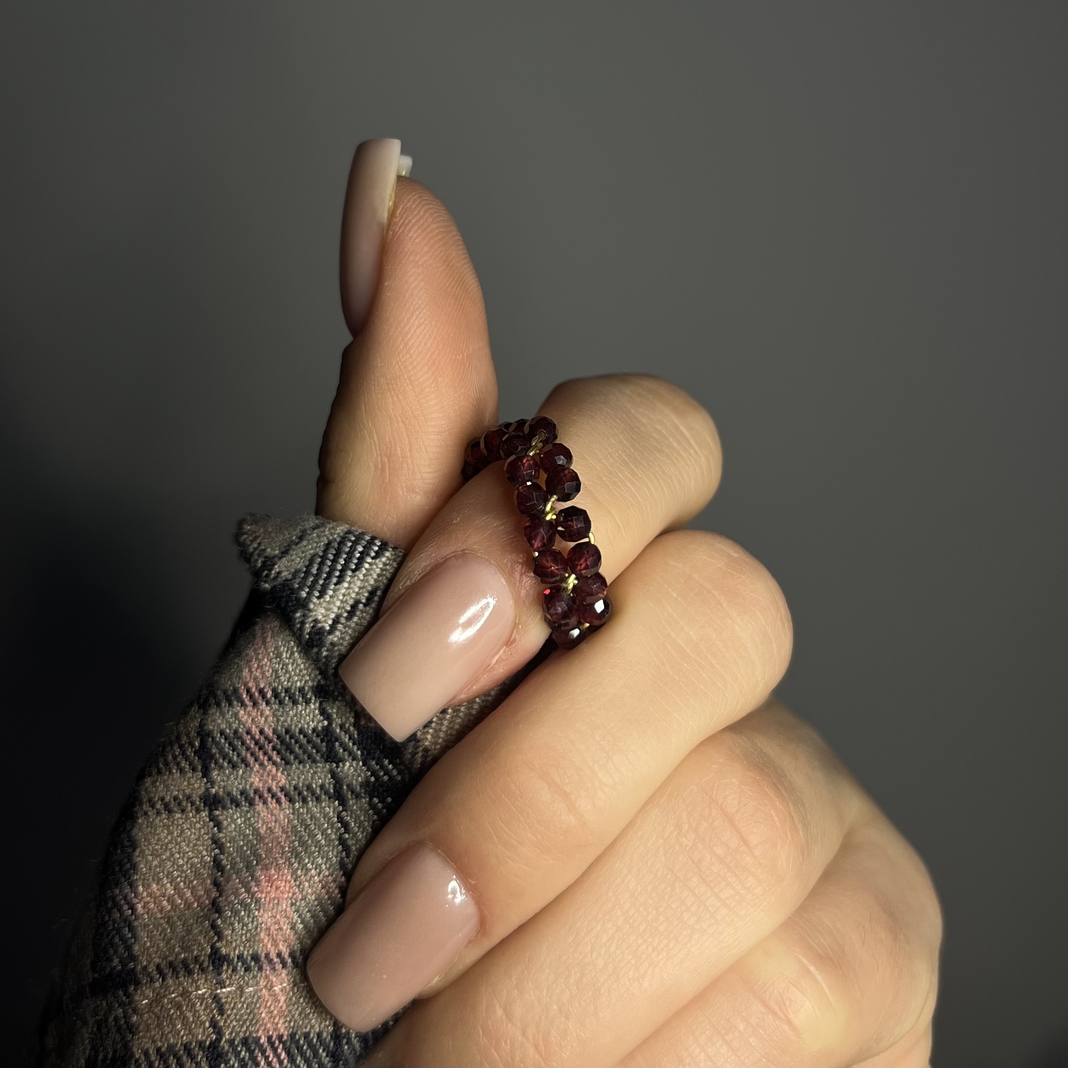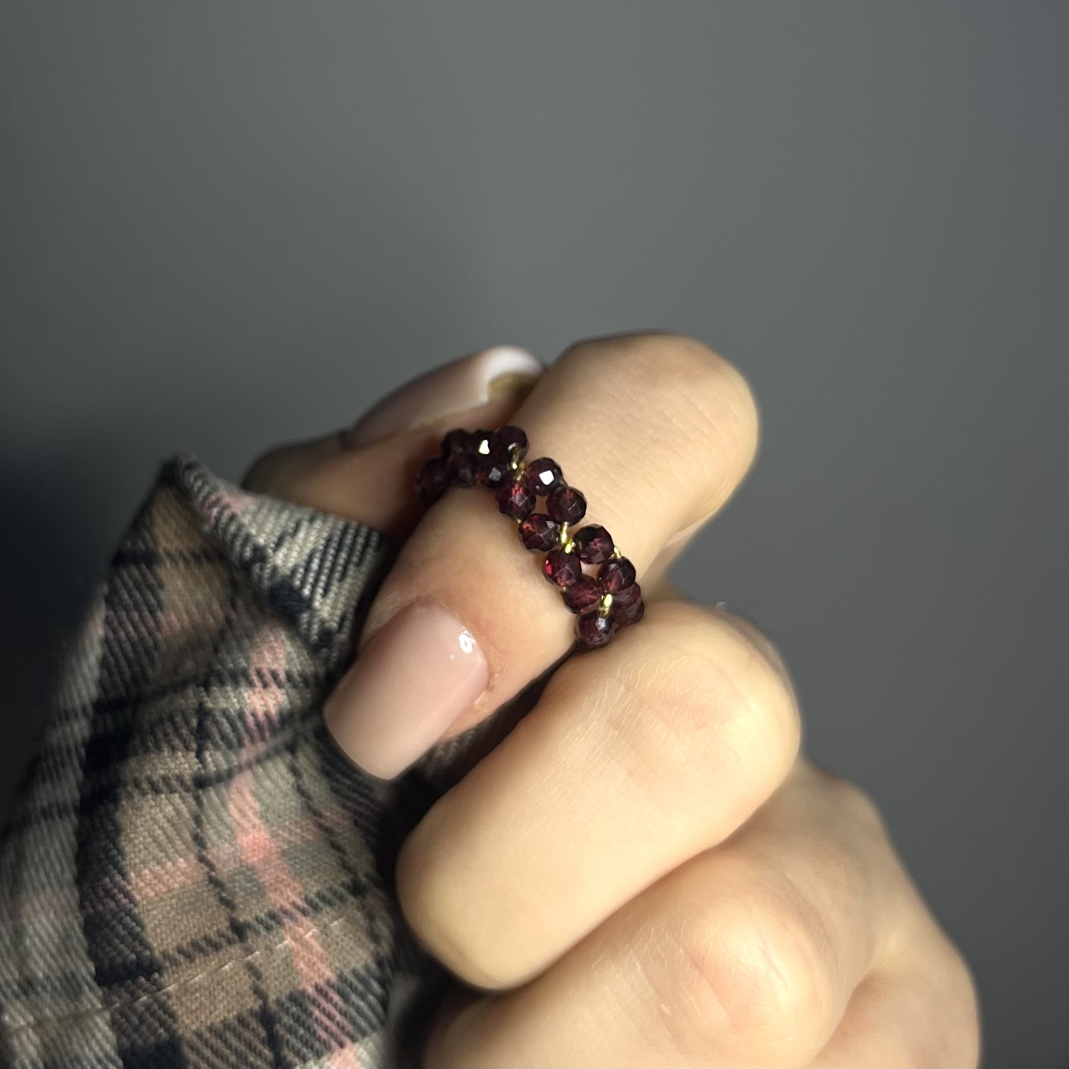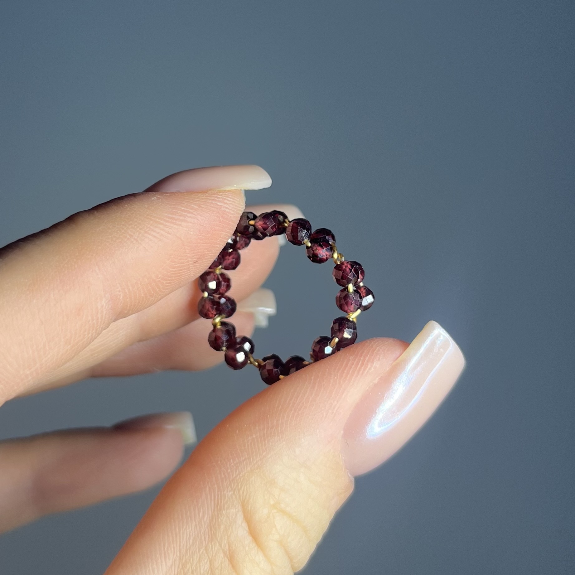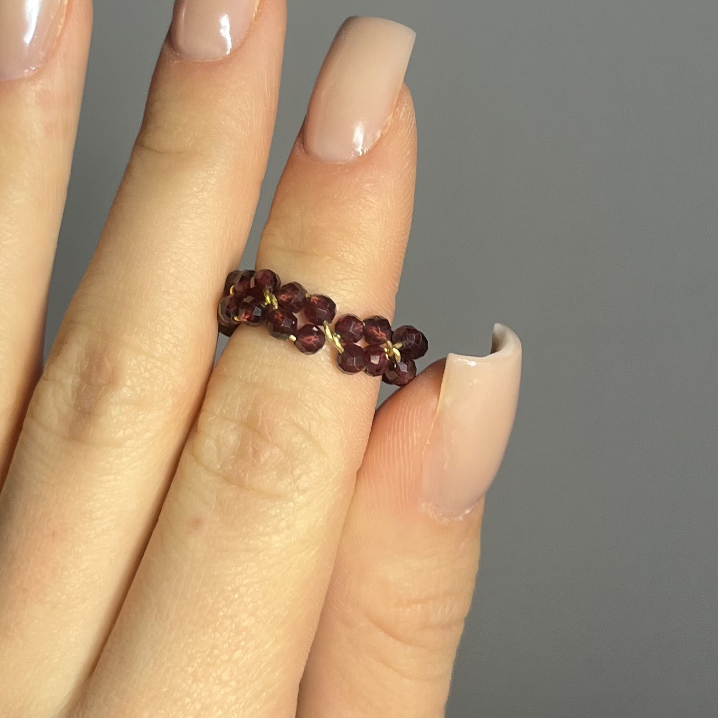 Ten pierścionek z granatu tworzę ręcznie z naturalnych, fasetowanych kamieni o głębokiej, bordowej barwie. Każdy kamień nawlekam na drucik i precyzyjnie zawijam, aby uzyskać delikatną, a jednocześnie trwałą formę biżuterii.