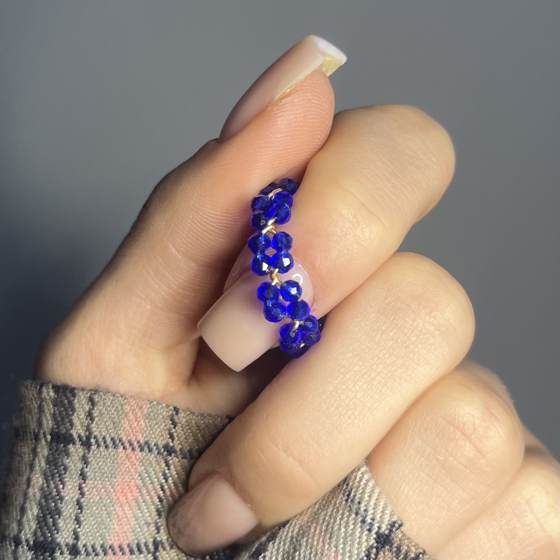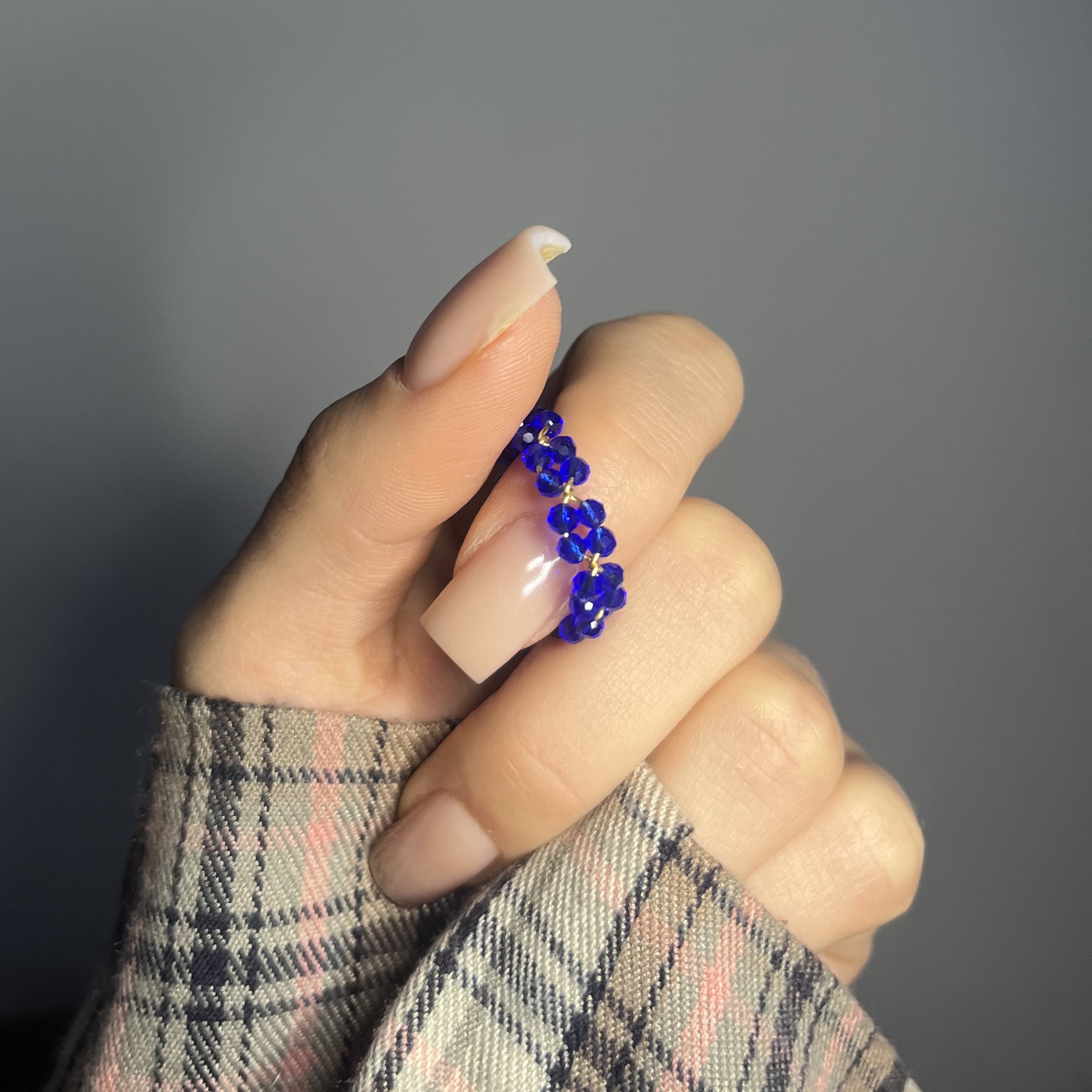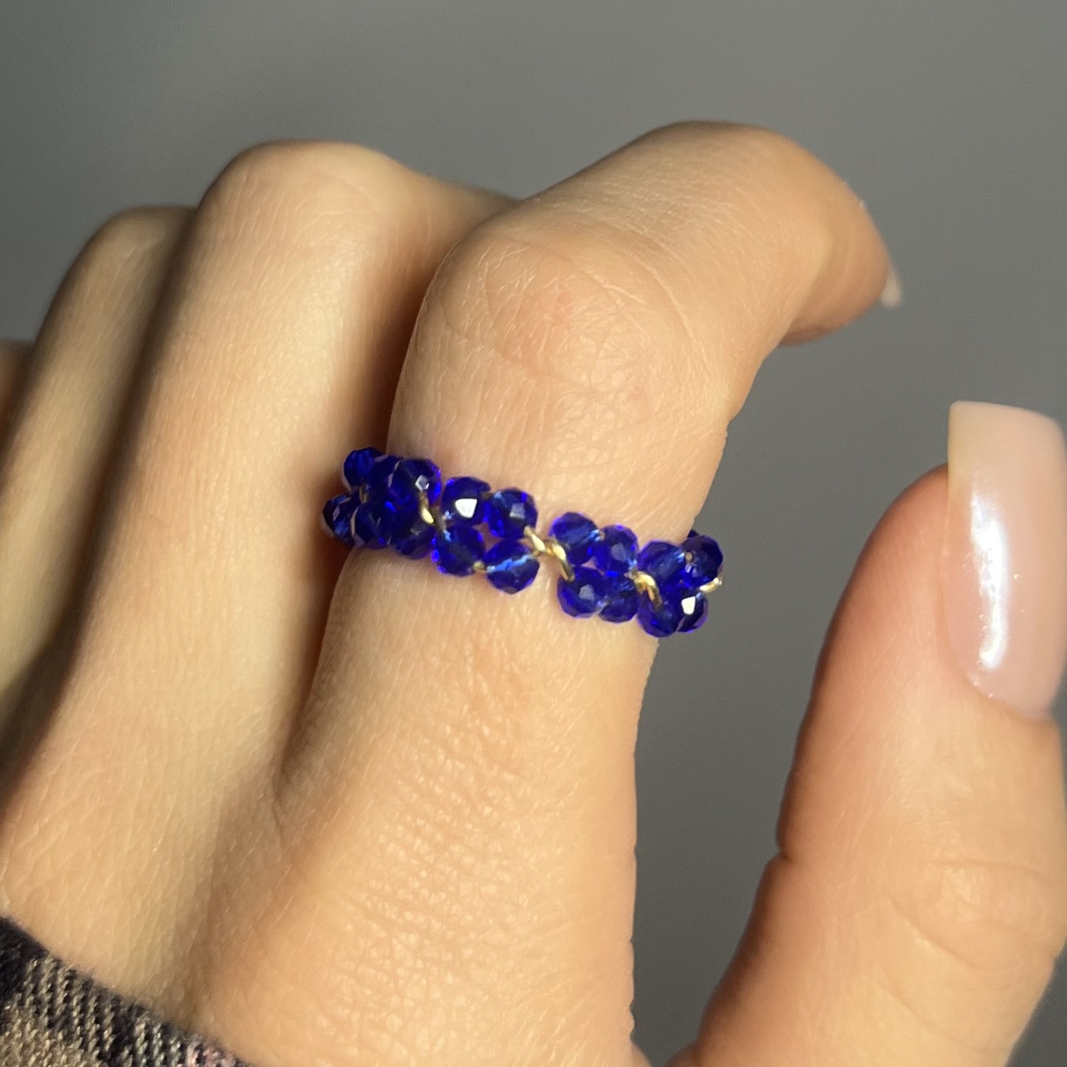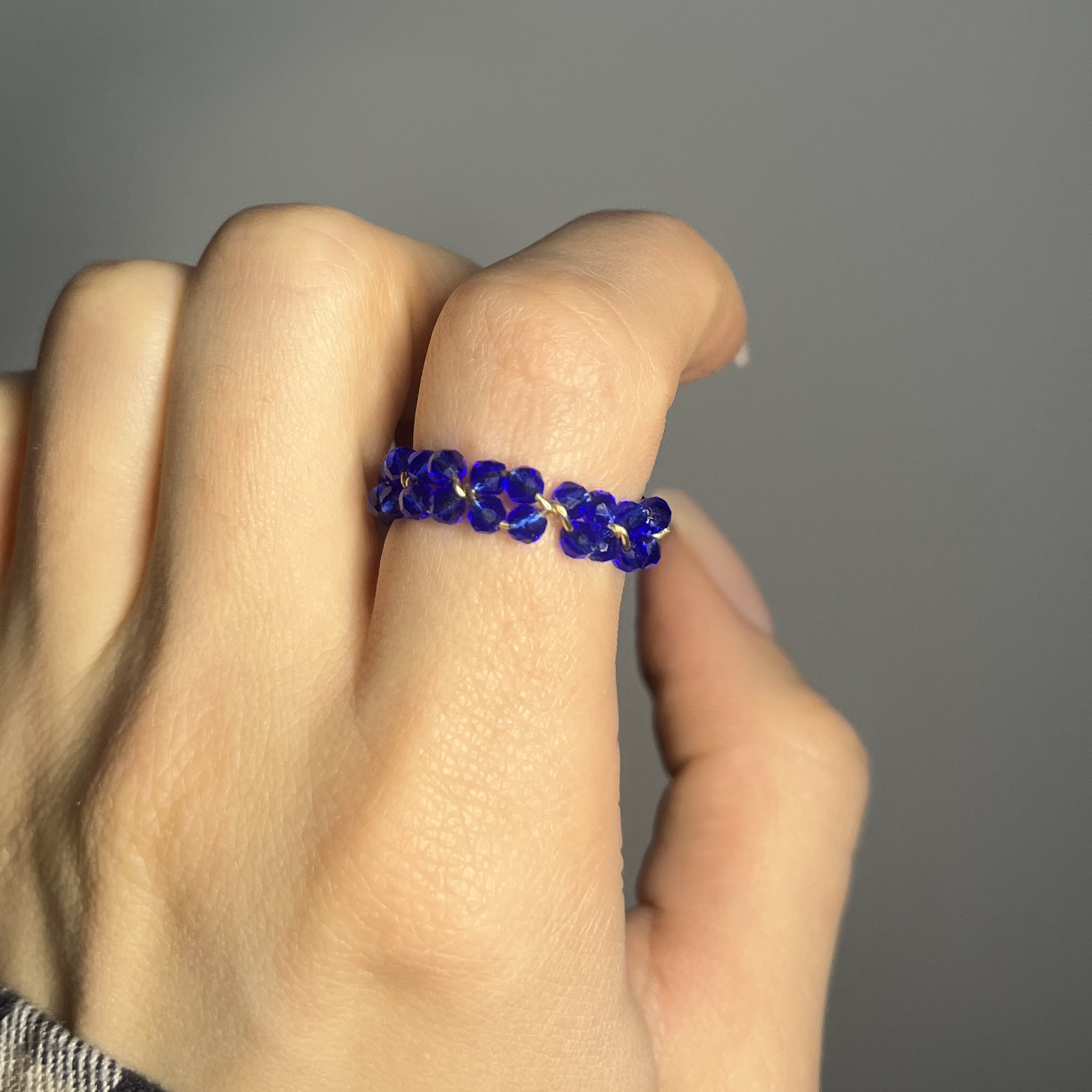 Każdy pierścionek powstaje poprzez ręczne nawlekanie koralików na drucik oraz precyzyjne zawijanie, co nadaje mu lekkości i trwałości. Co najważniejsze – każdy egzemplarz tworzony jest indywidualnie na zamówienie pod wybrany rozmiar, dzięki czemu pierścionek idealnie dopasowuje się do palca i jest komfortowy w noszeniu.
