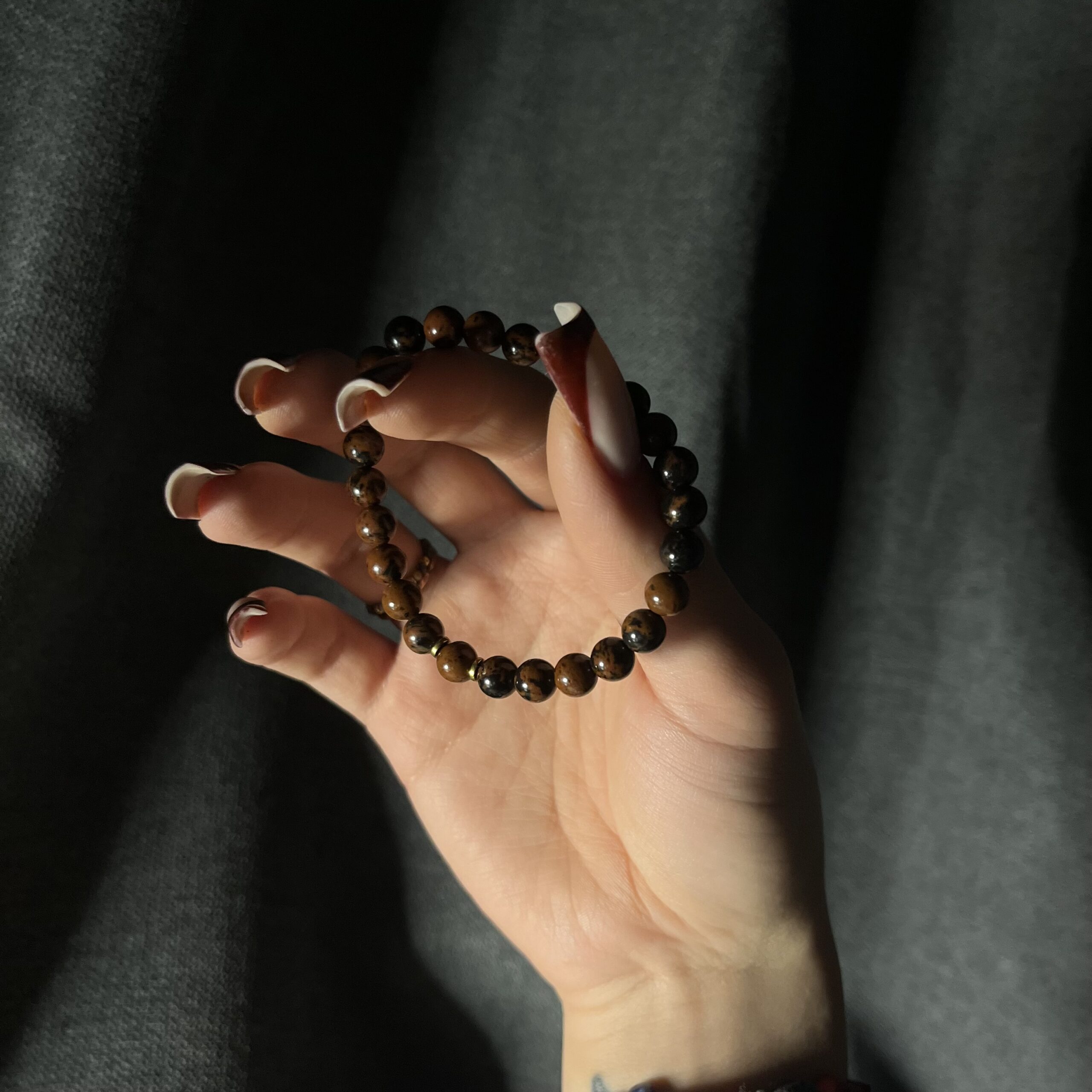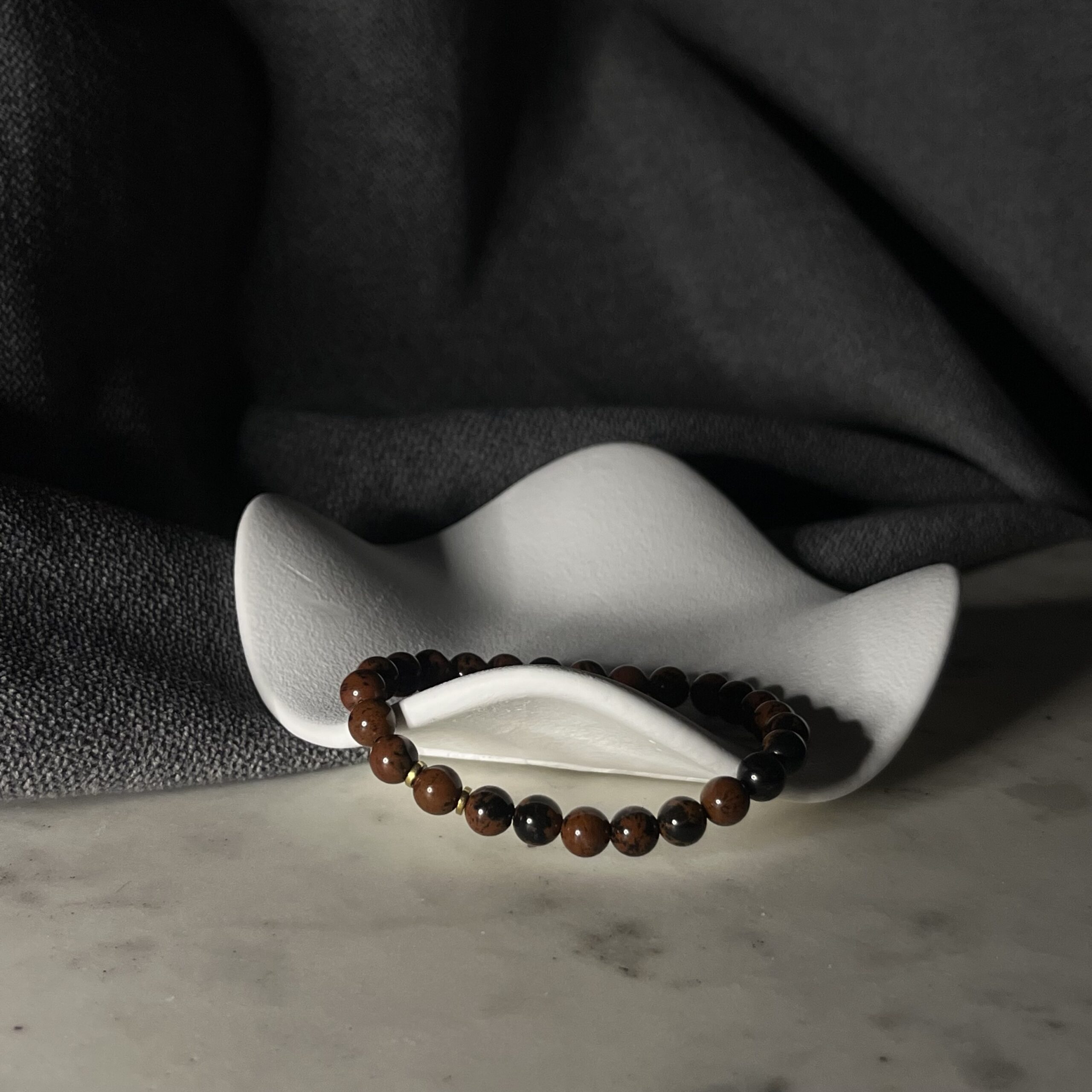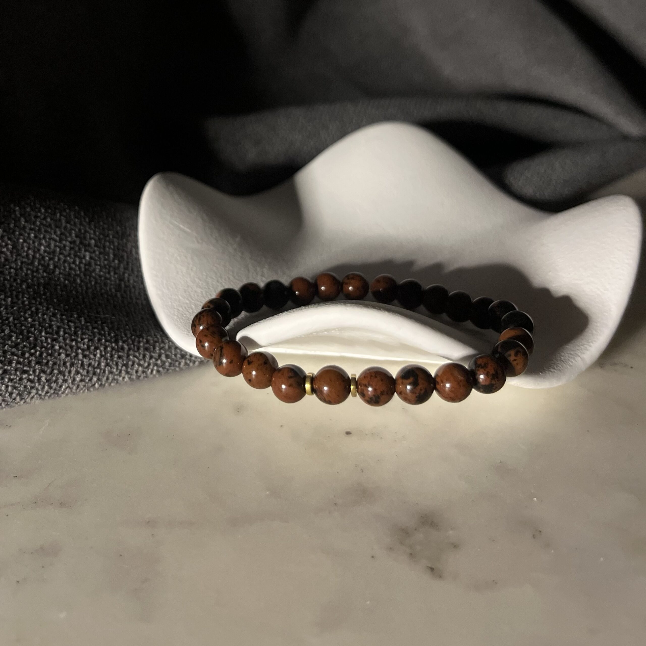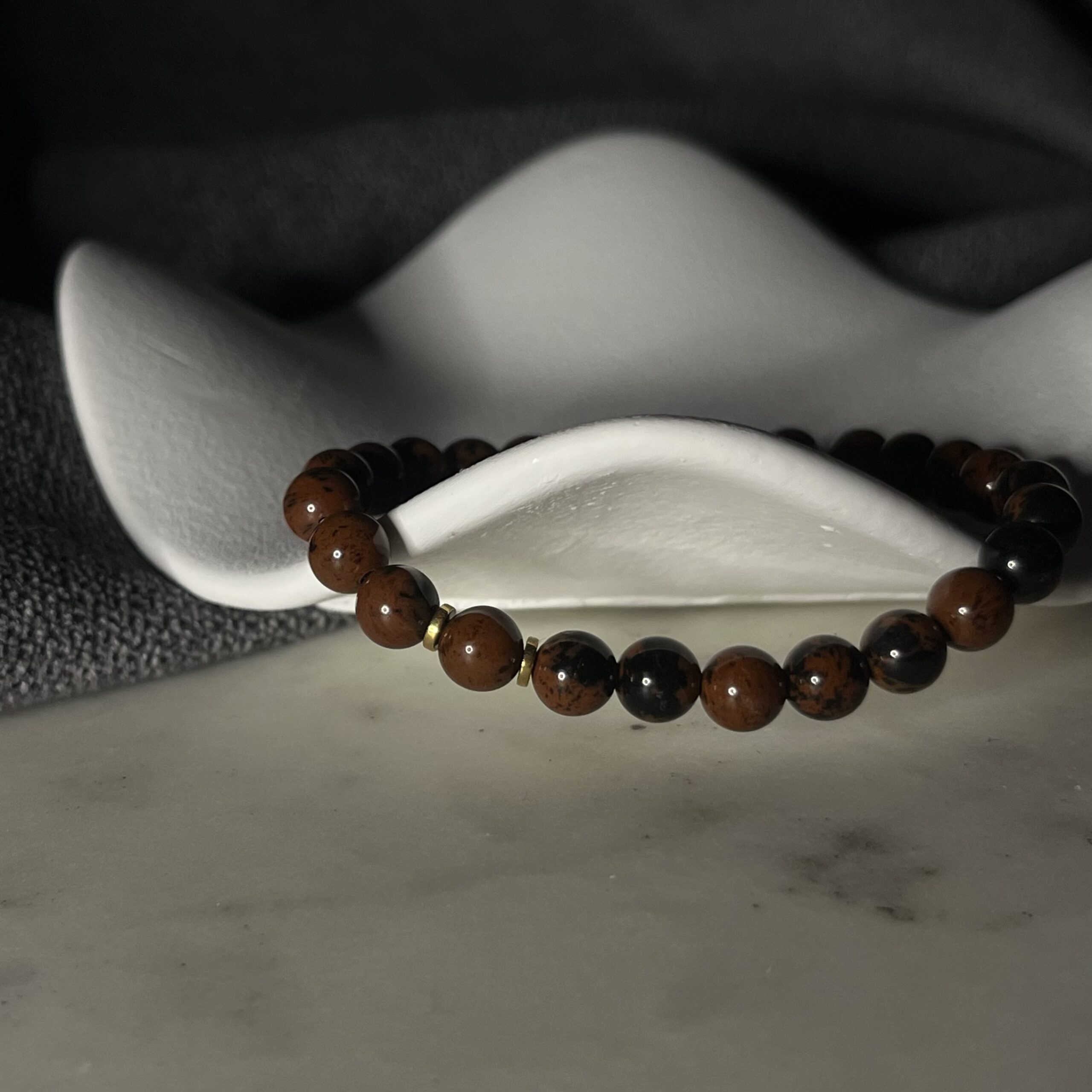 Gładko szlifowane koraliki tworzą elegancką, minimalistyczną całość. Dwie złote przekładki subtelnie podkreślają ciepłe refleksy bawolego oka, dodając biżuterii luksusowego charakteru. Bransoletka jest elastyczna, wygodna i idealnie dopasowuje się do nadgarstka.
