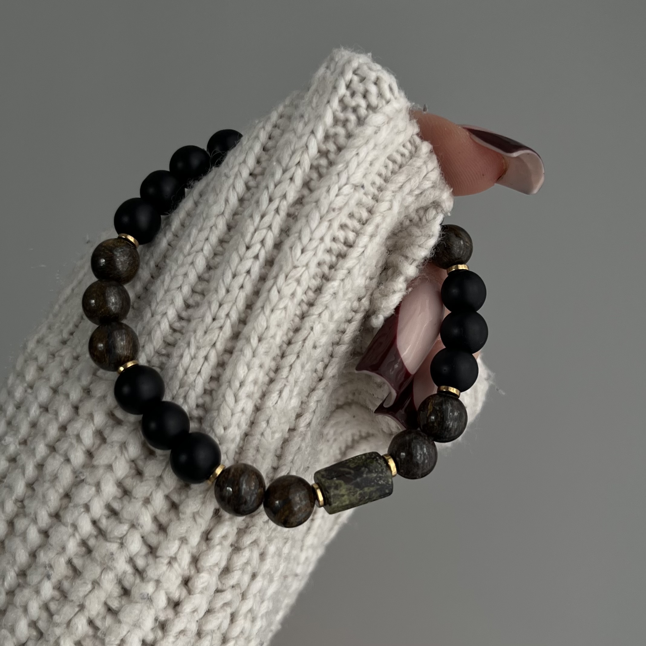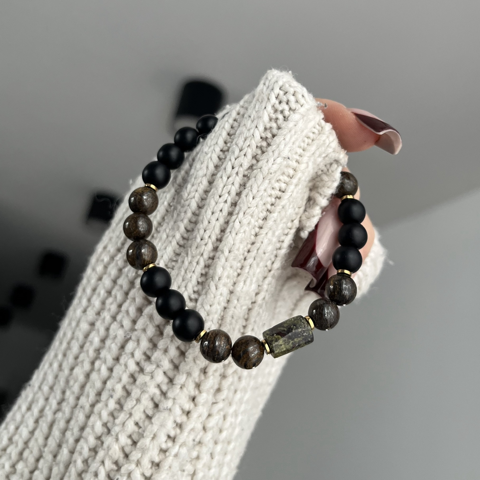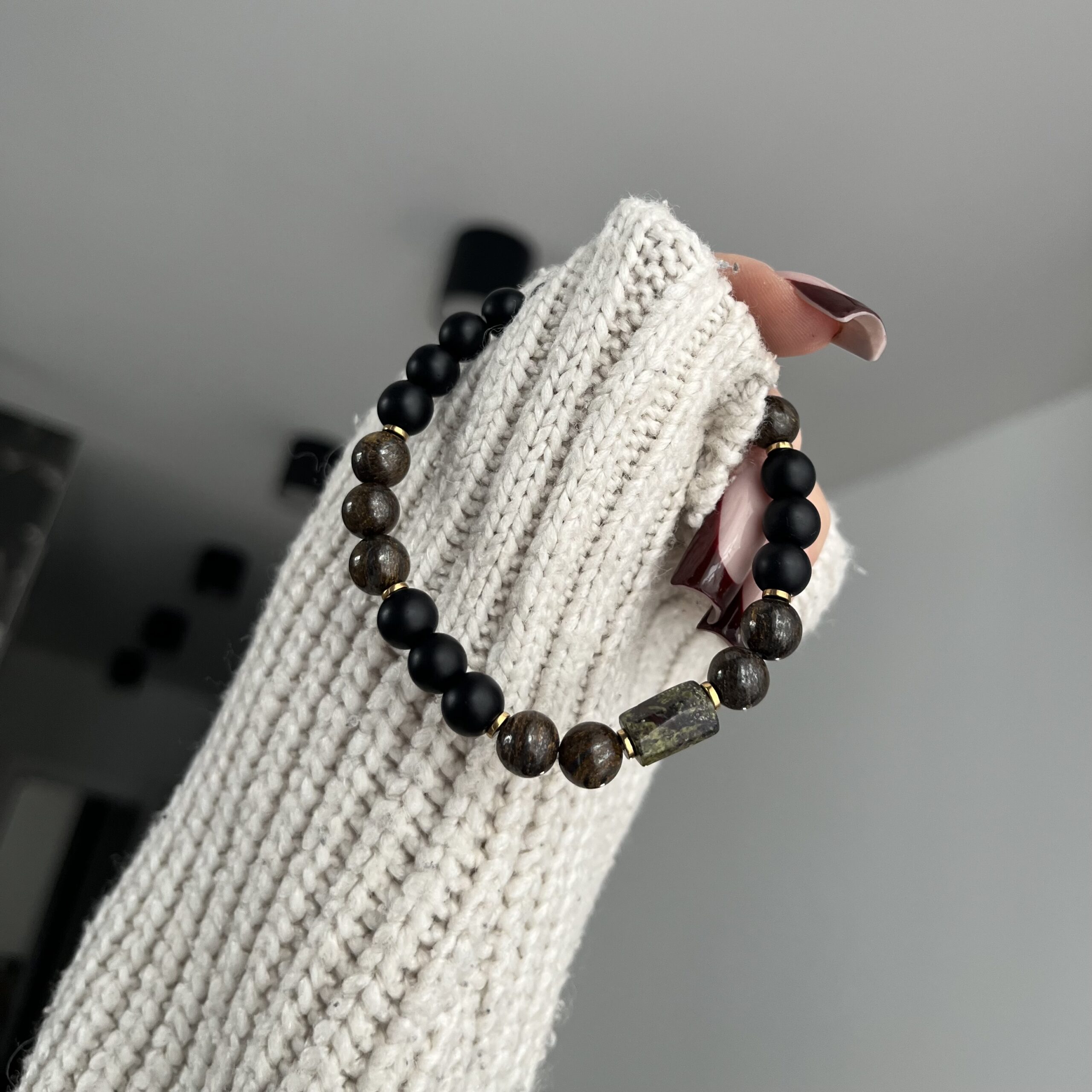 Bransoletka została wykonana ręcznie z wysokiej jakości matowych czarnych koralików oraz naturalnych kamieni w ziemistych odcieniach brązu. Centralny, nieregularny koralik z naturalnego kamienia dodaje całości surowego, męskiego wyrazu. Subtelne, złote przekładki podkreślają elegancję i nadają kompozycji wyrafinowanego charakteru.